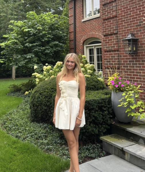 Senior Charlie Axus looked stunning at the homecoming dance in her dress from Oh Polly. The soft white color highlighted her natural glow, while the fitted bodice with ruching added a flattering, feminine touch. The subtle floral embellishments on the front of the dress added an extra layer of charm and sophistication. Her pearl bracelet and gold necklace were simple, yet paired perfectly with her dress. Ultimately, her look had beautifully balanced elegance, making her naturally stand out.