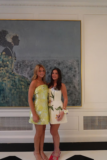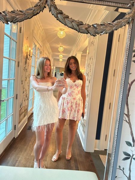 Sophomore Emmalyn Nevin (left) wore a stunning white dress from Retrofete paired with gold Loeffler Randall heels. Nevin’s look was the perfect balance of fun and classy. The sequins and feather touch added the perfect playful and unique touch.