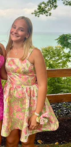 Freshman Ruby Halperin made an incredible impression on everyone at the dance. Her pink, yellow, and green floral-patterned dress from Revolve stood out against the soft pink background, giving her a bright, summery look. The dress’ fitted top and flared skirt created a flattering silhouette that felt both playful and stylish. The lightweight fabric added movement, making the dress perfect for the homecoming dance. Halperin’s dress captured the attention of many; the lively yet graceful style suited her perfectly.